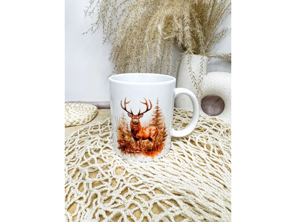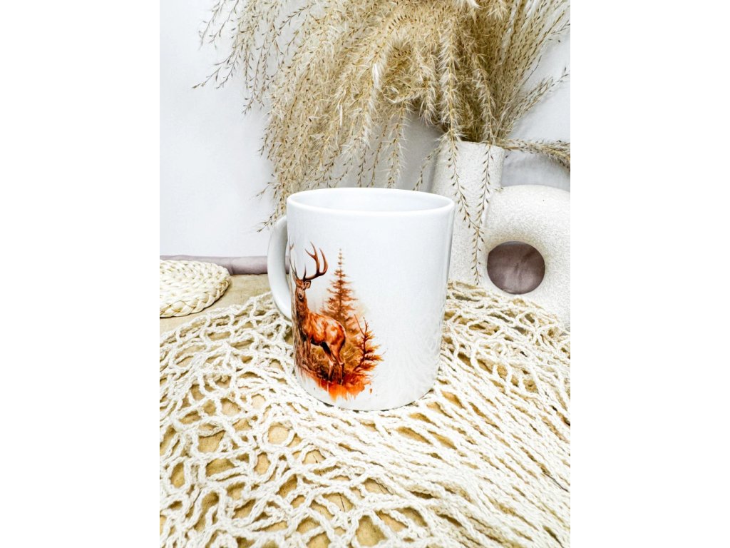 Keramický hrnek s přírodním motivem jelena v lese, ideální pro milovníky klidu, přírody a pohodových chvil s kávou nebo čajem.