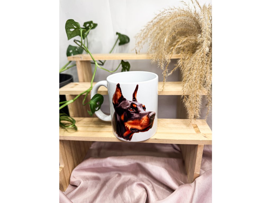 Stylový keramický hrnek s detailním potiskem dobrmana. Skvělý dárek pro všechny milovníky tohoto elegantního a oddaného plemene.