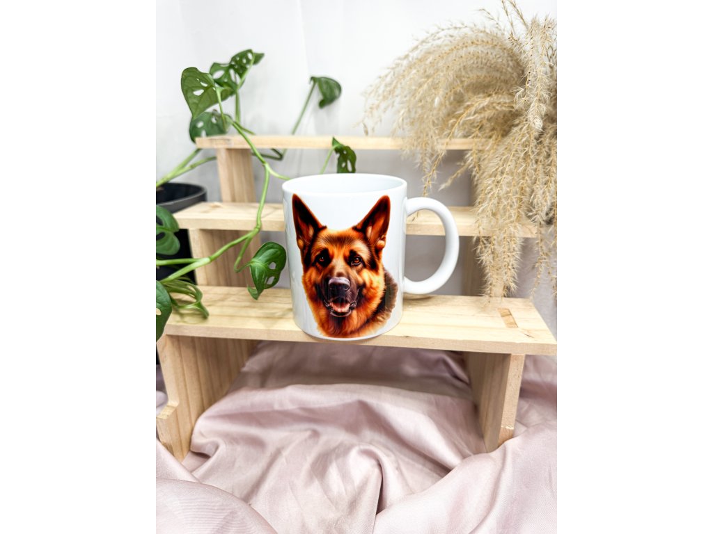 Kvalitní keramický hrnek s detailním potiskem německého ovčáka. Ideální pro milovníky tohoto věrného a inteligentního plemene.