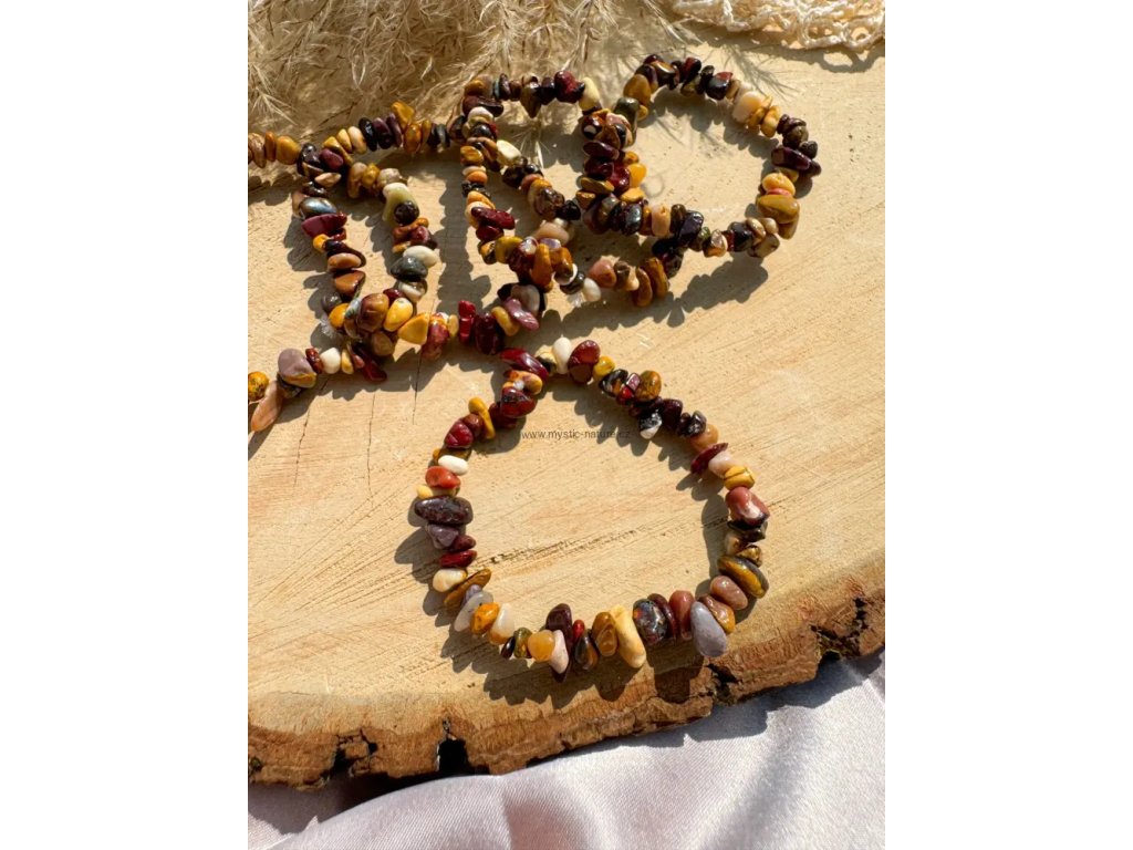 Náramek je navlečený z takzvaných zlomků jednoho druhu minerálu. Navlečen je na pružném dvojitém elastomeru.