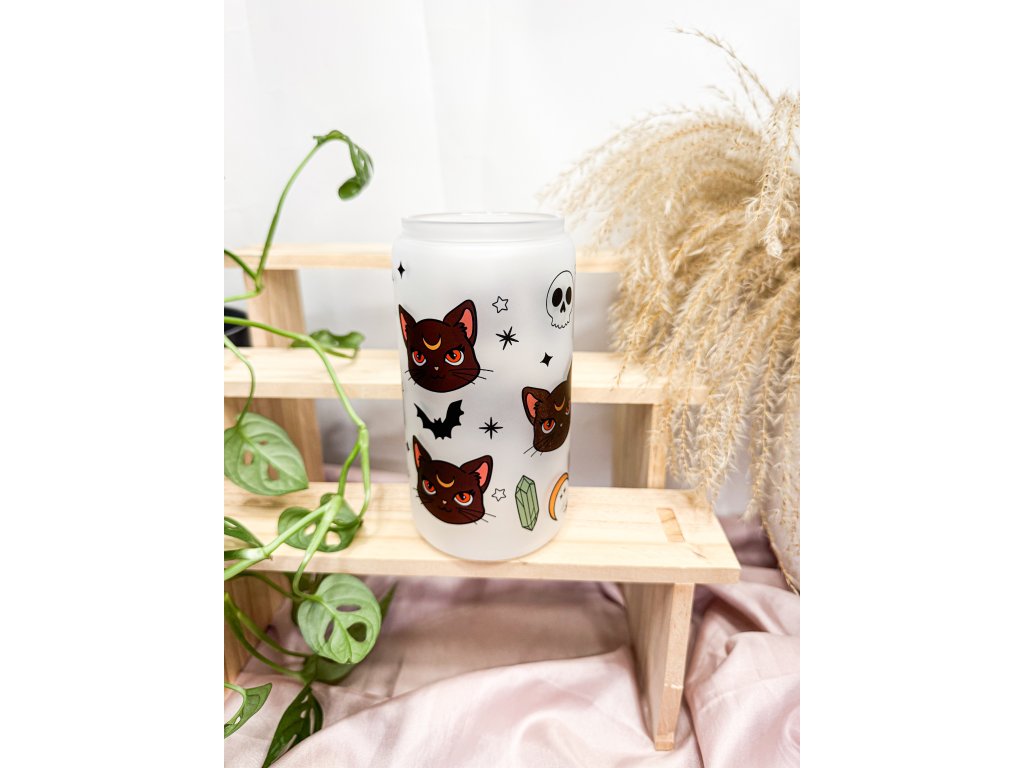 Originální mléčná sklenička s potiskem černých koček, netopýrů a krystalů. Magický doplněk na ledovou kávu, čaj nebo bubble tea.