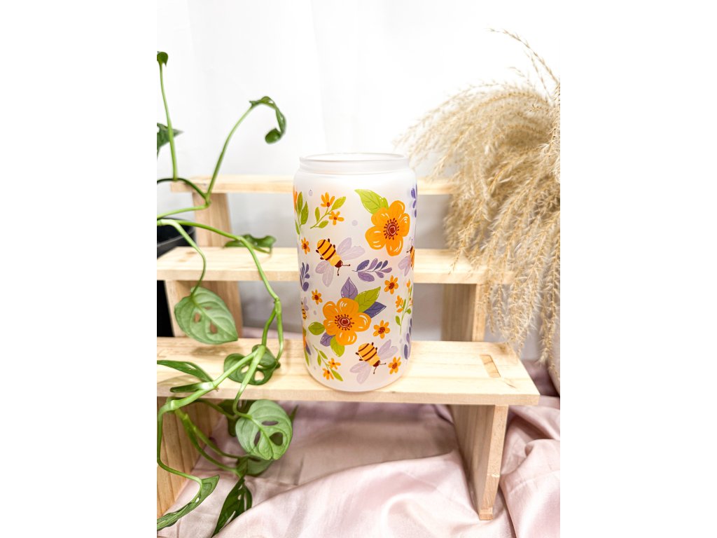 Jemná matná sklenička s potiskem květin a létajících včel. Ideální pro všechny, kteří milují přírodu, léto a pozitivní energii.