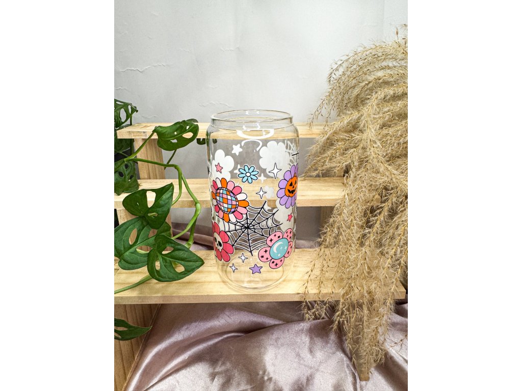 Podzimní atmosféra, lehký nádech tajemna a hravý design v jednom 🎃🕸️ Tato čirá sklenička kombinuje barevné dýně, květiny a pavučiny do originálního motivu, který je stylový, veselý a zároveň jemně halloweenský.