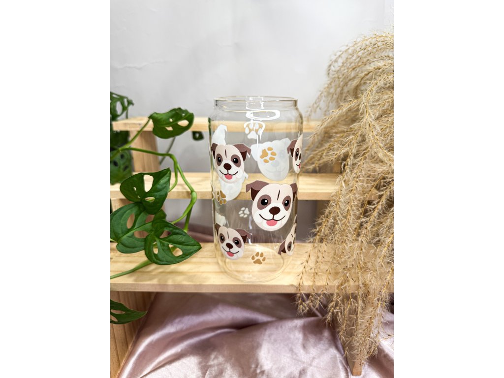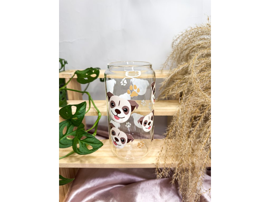 Roztomilá čirá sklenička s motivem psa mopse, která potěší každého milovníka psů a dodá každému nápoji hravou atmosféru.