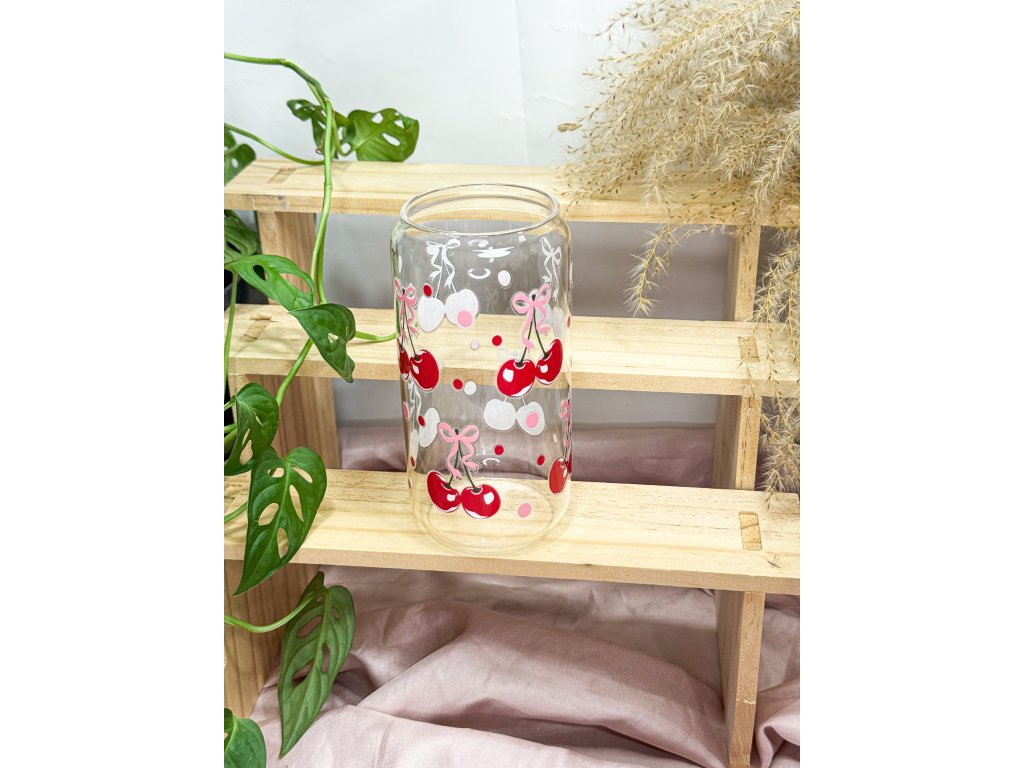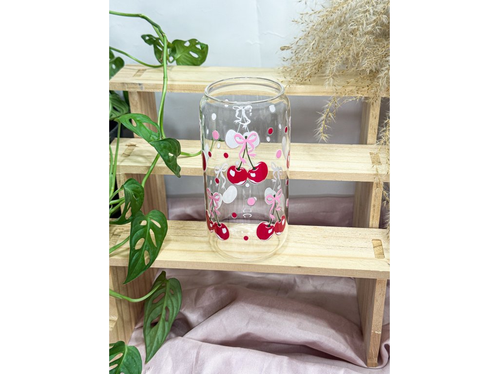 Elegantní čirá sklenička s jemným motivem třešní a mašlí, která spojuje hravost, romantiku a stylový design.