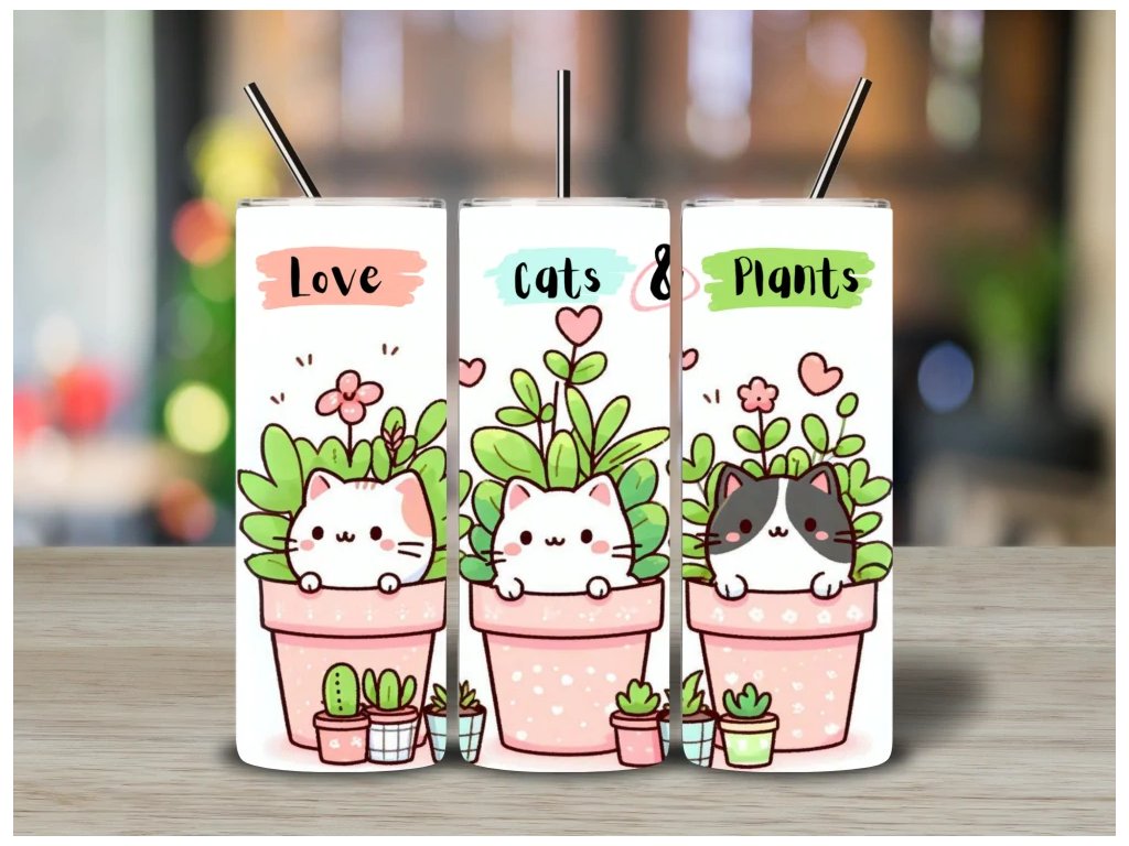 Roztomilý termohrnek s ilustracemi kočiček pohodlně sedících v květináčích a nápisem Love, Cats, Plants. Perfektní pro milovníky mazlíčků i pokojovek.