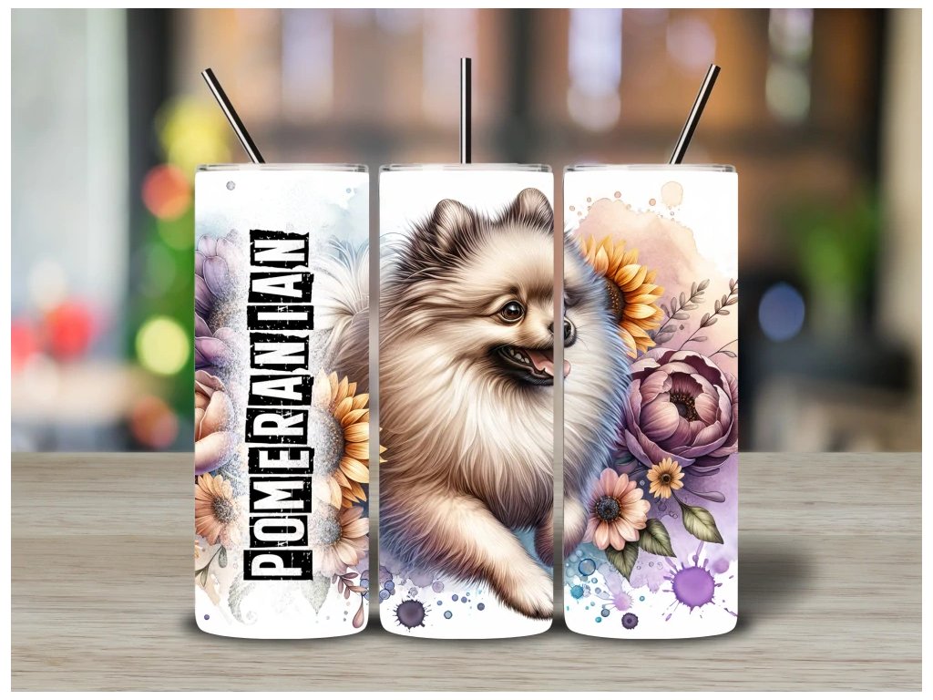 🐶 Roztomilost v hrníčku! Tento termohrnek zdobí pomeranian, doplněný o něžné květinové motivy, které dodávají designu jemnost a eleganci.