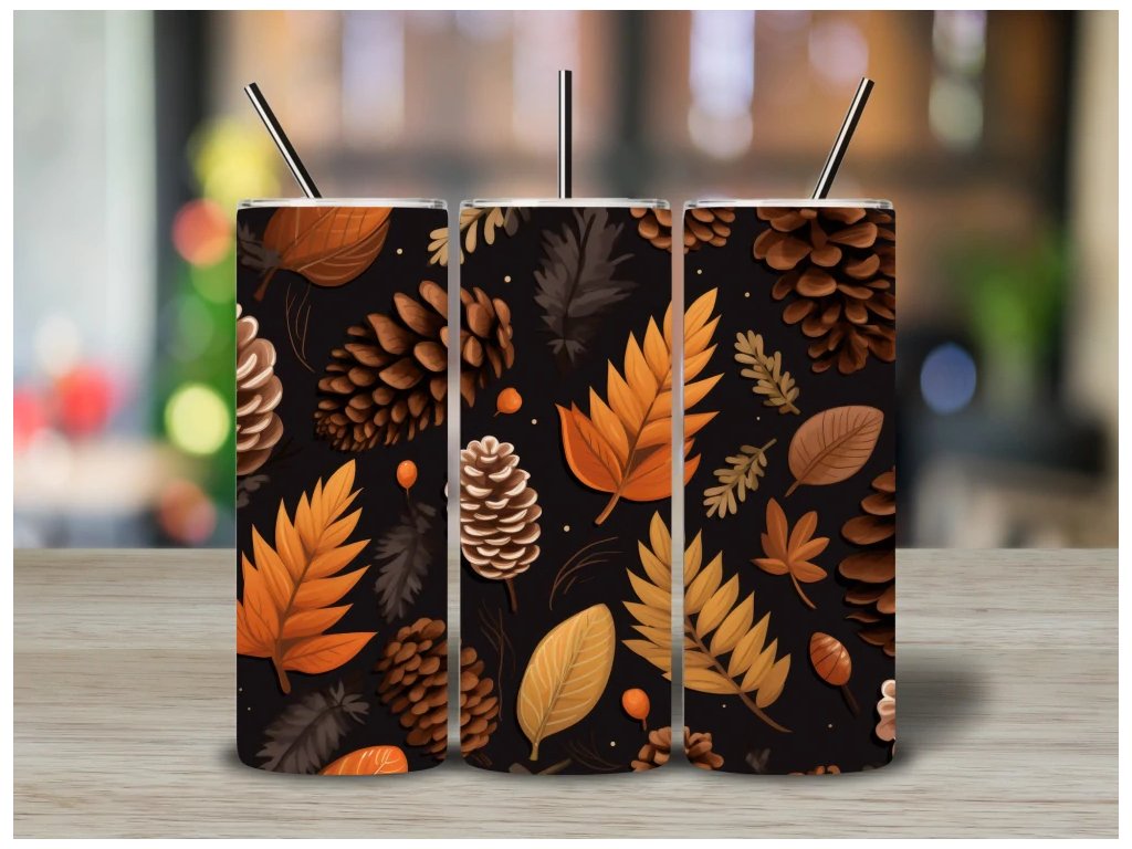 Elegantní termohrnek s podzimními listy a šiškami na tmavém pozadí. Ideální pro milovníky podzimu, tepla, horkého čaje i klidných chvilek s knihou.