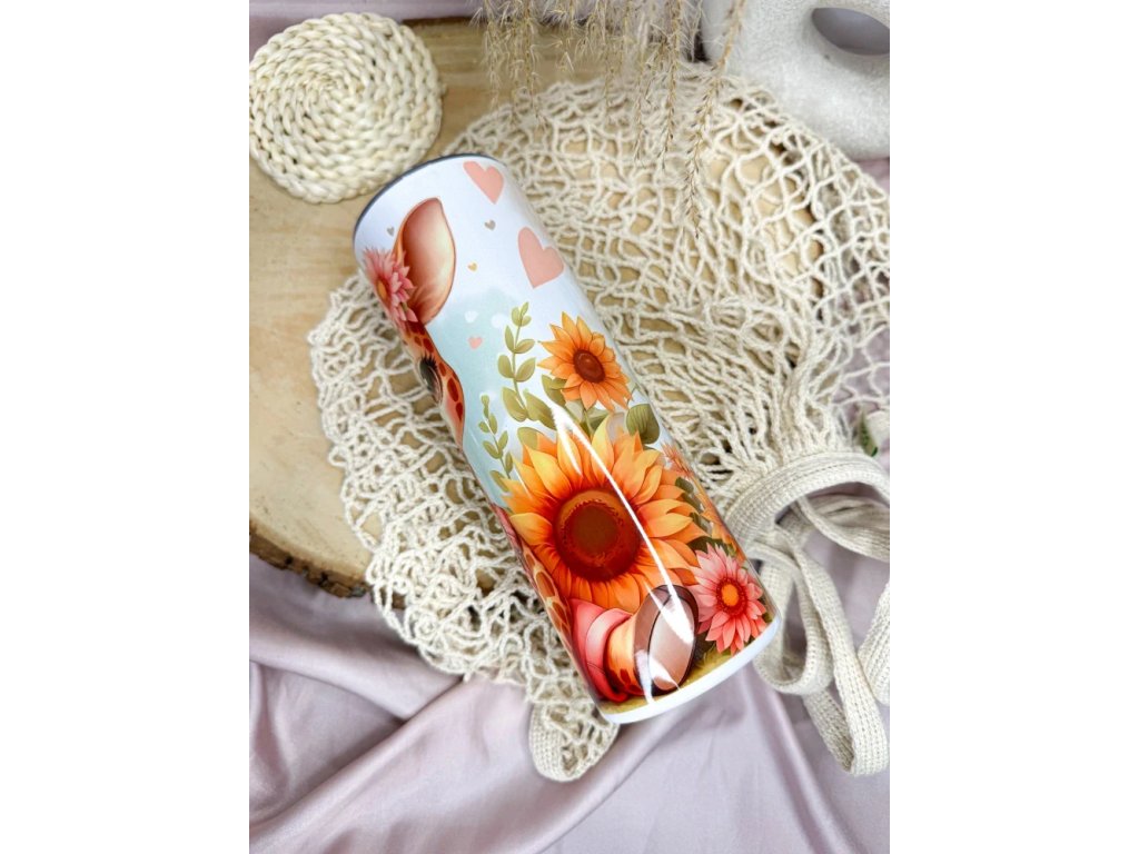 Stylový termohrnek s motivem žirafy obklopené slunečnicemi, který rozzáří každý den a udrží nápoj dlouho teplý i studený.